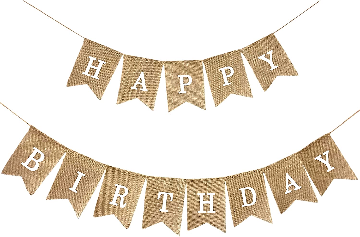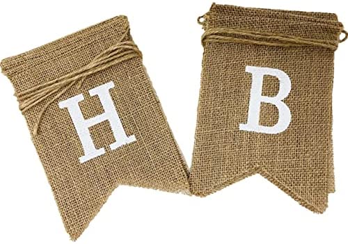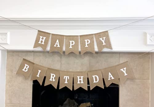 Reusable 2 Piece Burlap Banner. Burlap piece size: 5 inches x 7 inches (W x H). Color: White print on rustic burlap. String length: Happy 8 feet and 7 inches and Birthday 9 feet. Material: 100% reusable burlap. Pre-made: No DIY and distance between each burlap piece can be adjusted. Simple to hang, fold and store.