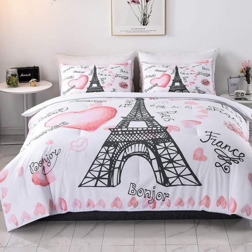SHINICHISTAR Queen Size The Eiffel Tower Comforter Sets 3 Pieces Paris Bedding Set for Kids Teens Girls Heart France Bedroom Decor