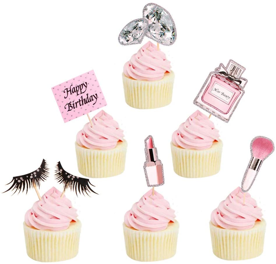 Showall 28Pcs Makeup Cupcake Toppers Glitter Birthday Cake Picks for Bridal Shower Spa Party DecorationsMaterial: Non-Shedding glitter card and food grade sticksPackage: Total 28pcs, 4 X Happy Birthday, 4 X Diamond, 4 X Makeup Brush, 4 X Lipstick, 4 X Perfume, 4 X Pairs of false eyelashesSize:Happy Birthday 3*5.6 inchDiamond 3.4*5.4 inchMakeup Brush 2.2*6 inchLipstick 1.2*6 inchPerfume 2.4*6.4 inchFalse Eyelashes 2.6*4.2 inchPerfect for wedding shower, birthday party, anniversary, theme party, girls spa party and other events.