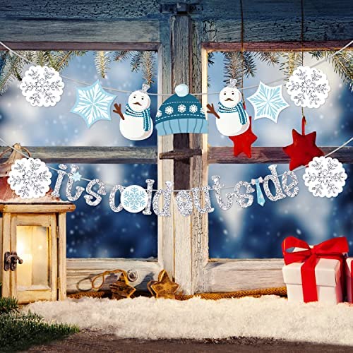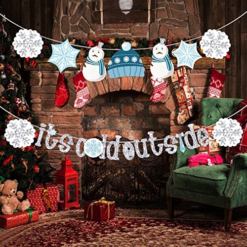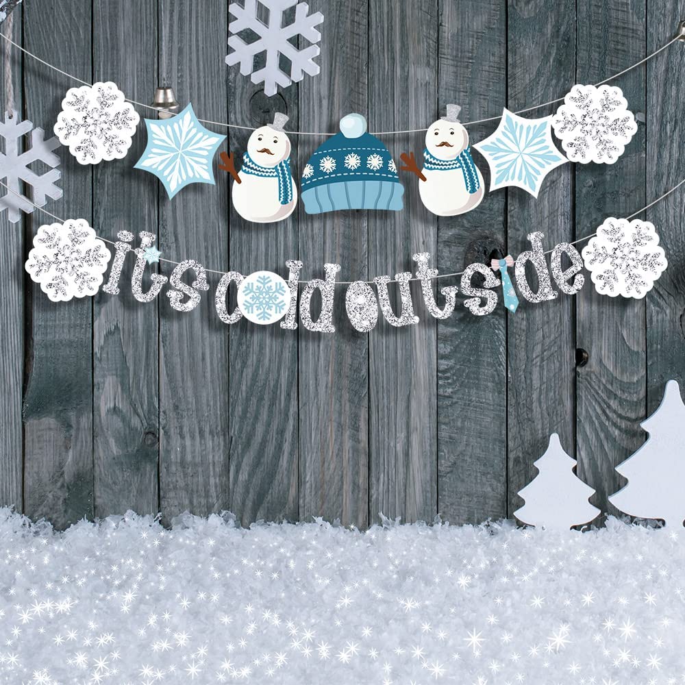 Silver Glittery Its Cold Outside Banner – Winter Baby Shower Decorations, Blue Snowman and Snowflake Party Decorations, Winter Wonderland Birthday Decorations, Christmas Party Decorations