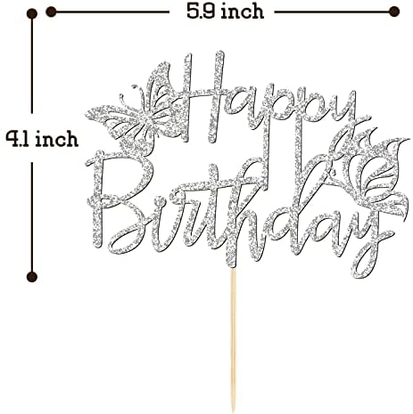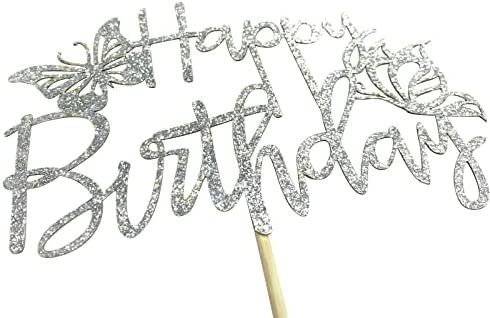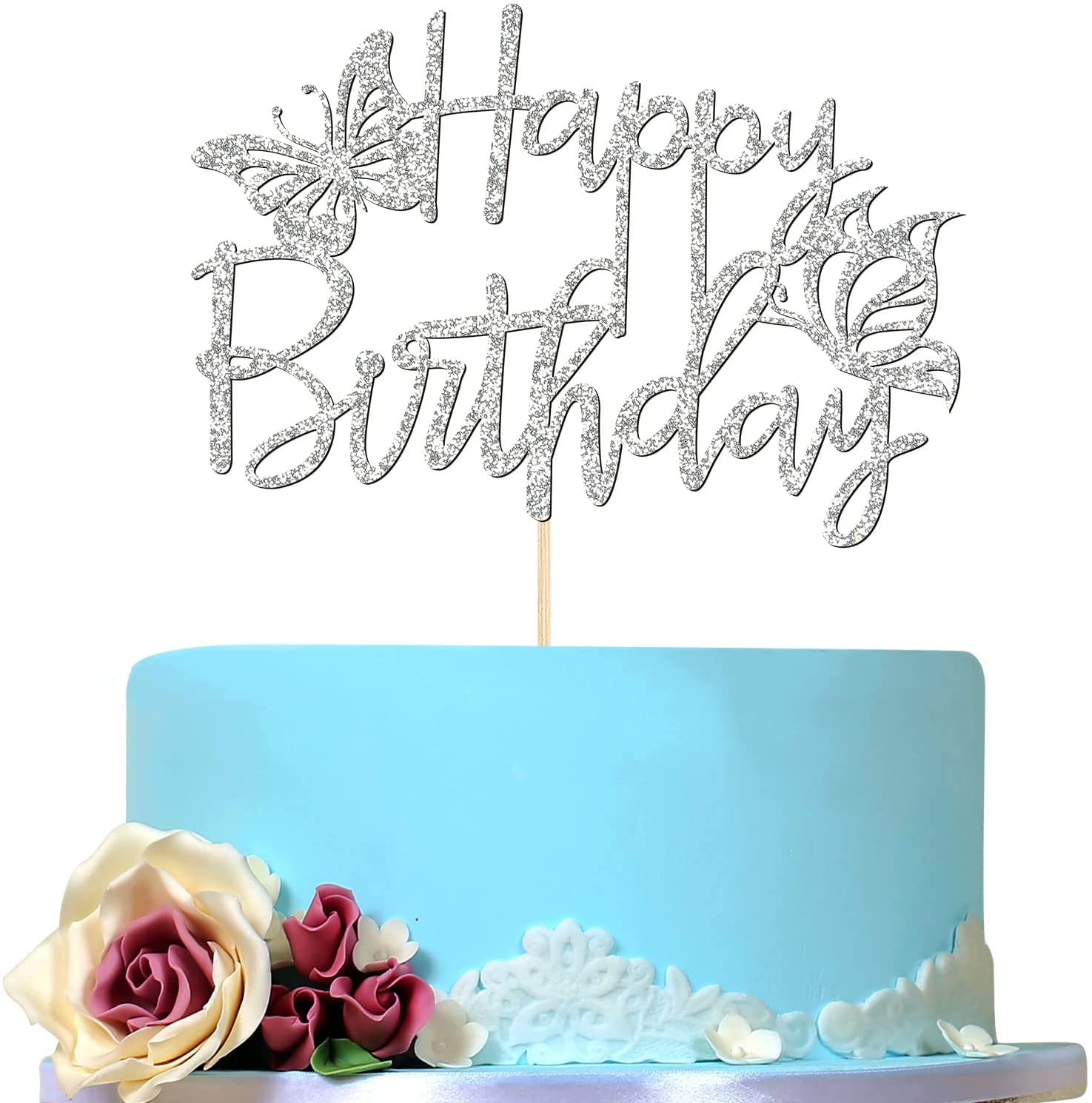 Silver Happy Birthday Cake Topper with Butterfly, Butterfly Cake Decor for Girl 1st 2nd 3rd 4th 5th 10th 21st 30th 35th 40th 50th Birthday, Butterfly Birthday Decorations, Womens Birthday / Wedding Anniversary Party Supplies