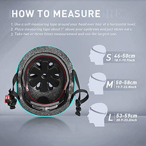Size Chart : Small: 18.1”- 19.7”, Medium: 19.7” – 22.8”, Large: 20.9” – 23.2”. These Skateboarding helmets come with an adjustable strap which make it flexible to fit you. The flexibility of the strap make it a unisex product and would fit both well for both men and women, boys and girls.