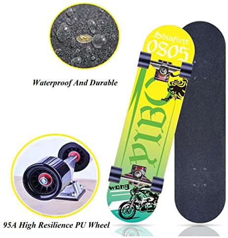 The color and graphics design on the board is quite creative and eye-catching, you will definitely stand out among your friends across the different age range. Also, the pattern is printed with Heat Transfer Printing onto the board, durable and last for a long time.Beautiful and fashionable, colorful and flashing. The heat transfer pattern, the color is clear, the waterproof does not fade, so that the skateboard is easier to control and safer,
