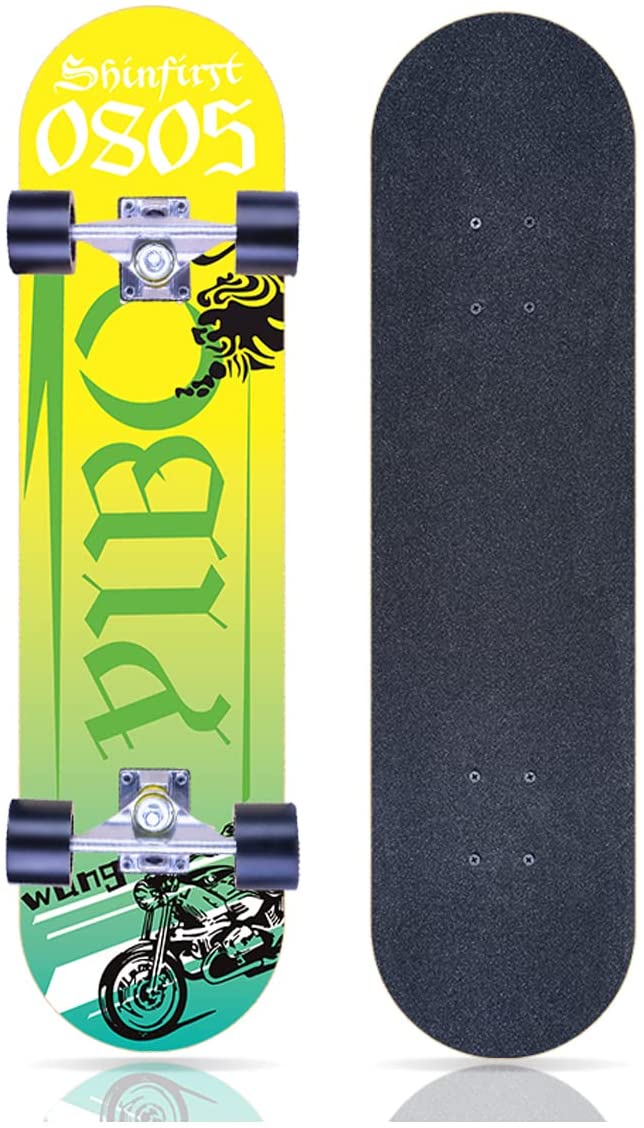Durable and Stable,Smooth and Speedy Ride: The complete skateboard (80cm long × 19cm wide full-size double kick concave surface designcomes) with thicken 7 layers canadian maple wood, strong and durable to withstand riders up to 220 lbs. Suitable for all-level riders (kids,adult,boys,girls)with different riding styles, cruising, commuting and tricks and freestyling.