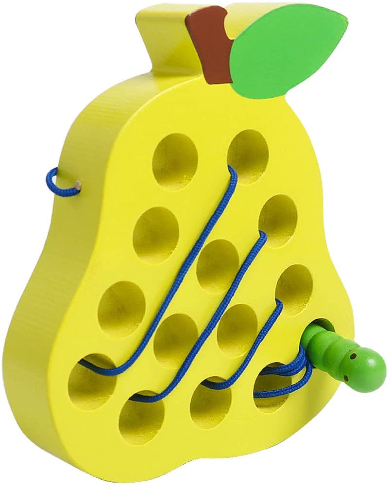 FUN AND CREATIVE: The Wooden Lacing Pear Toy is a simple, vivid yellow pear with smooth holes and green leaf look so much delicious, let the hungry caterpillar eat it sooner. Help the string-attached caterpillar munches through the pear by threading in and out. Perfect for training and developing personal skills. EARLY EDUCATIONAL & SKILLS DEVELOPMENT: Traditional teaching Montessori activities can build early develop lacing and sewing skills for develop hand-eye coordination and intellectual development, fine motor skills. It can help increase the imagination and coordination of the kid. Parents playing with children will bring establish close interaction and communication.Whether at home or on the way airplane, car to create good childhood memories. METERIAL & SIZE: It is made of Environmental protection and non-toxic paints material.The wooden part is made of 100% Nature Wood, no chemical smell, no sharp edges. The strings are securely attached to the blocks. Pear size about 5.8 x 5 x 1 inches. Weight:9 oz. Super easy for small hands to hold and play. BEST TRAVEL GAME: The pocket sized toy, light weight thats sure to entertain your child. Easy for childrens to hold and play, Whether its at home, at school, or on the road, its a good choice. Perfect for trainning space and patience skill.
