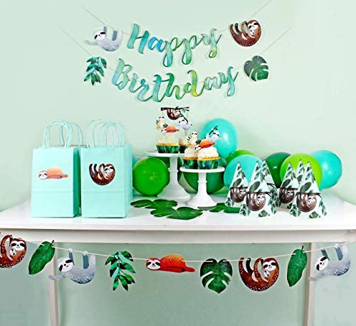 Sloth Party – Happy Birthday Banner | Watercolor | Sloth Birthday Decorations | Photo Prop | Tropical Leaves, Sloth Garland, Lets Hang