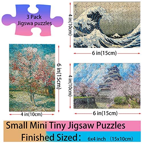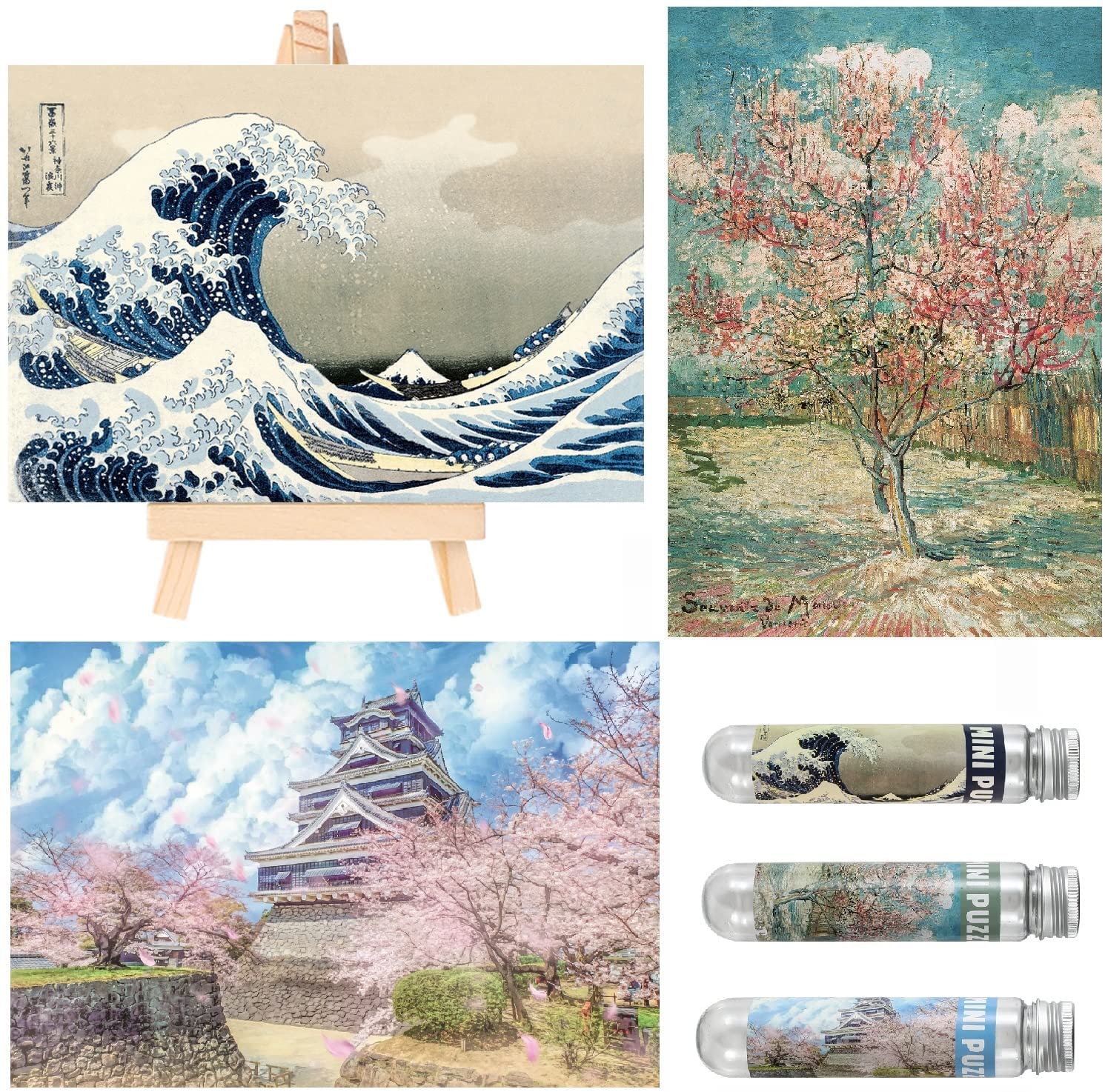 Small Jigsaw Puzzles for Adults 150 Pieces Mini Jigsaw Puzzles Challenging Sakura Castle Ukiyoe Sea Wave Tiny Jigsaw Puzzles 6 x 4 Inches, 3 Pcs,Mini Easel Included