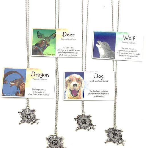 Made in USA and Imported CHILDRENS TOTEM ANIMAL NECKLACES – Compass Necklace: Dog, Deer, Wolf, Dragon. One for each friend representing the pack of four. Cute Party Favors for Friends. TOTEM ANIMAL KEEPSAKE MINI CARDS – Deer Dog Dragon Wolf. SIZE: 3.5×2 inches. PAPER: Ultra-thick, glossy coated. ARTIST: The animal images were painted by a young 11 year old juvenile artist. Also includes a blank card to write a note in the gift. TOTEM ANIMAL MESSAGES – Dragon: Peaceful Warrior, Deer: Unconditional Love, Dog: Loyal and adventurous, Wolf: Trusting Instincts. A longer description of each animal is on the back of each card. TOTEM SPIRIT ANIMAL COLLECTION – A totem is the spirit animal (guide) that a person is drawn to. Identifying with the animals qualities, behaviors, and characteristics are generally the attraction. Often people are attracted to animals like themselves or the “self” they desire to become. GIFTS AND USES – Great for kids especially if they have three friends and want to be a tribe. These are a limited edition so buy them while they are available. 🙂 We need to clear these out for new items so they are discounted.