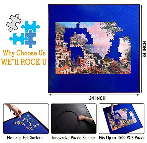 NON-FELT SURFACE – This deluxe puzzle organizer is covered with non-slip felt surface that will protect your board and your puzzles pieces while the 1/2-inch lip helps keep your pieces secure when spinning DURABLE CONSTRUCTION – Constructed of durable solid hardwood rim and durable fiberboard, this Puzzle Spinner measures 34 x 34, compatible with most puzzles of 1500 pieces or less ROTATING PUZZLE BOARD – Innovative puzzle spinner features smooth and steady rotation, lets you spin the puzzle to reach the section you need FAMILY FUN PUZZLE TABLE – Whether you are putting together jigsaw puzzle by yourself or playing board games with the family, this jigsaw puzzle table makes it easy for everyone to reach the board and pieces from any spot around the table; Even kids with short arms can reach the pieces on the other side of the board now MONEY BACK GUARANTEE – We guarantee you will love the well-packaged Puzzle Ready puzzle storage box. We offer a money back guarantee and we stand behind the workmanship and quality of each puzzle board