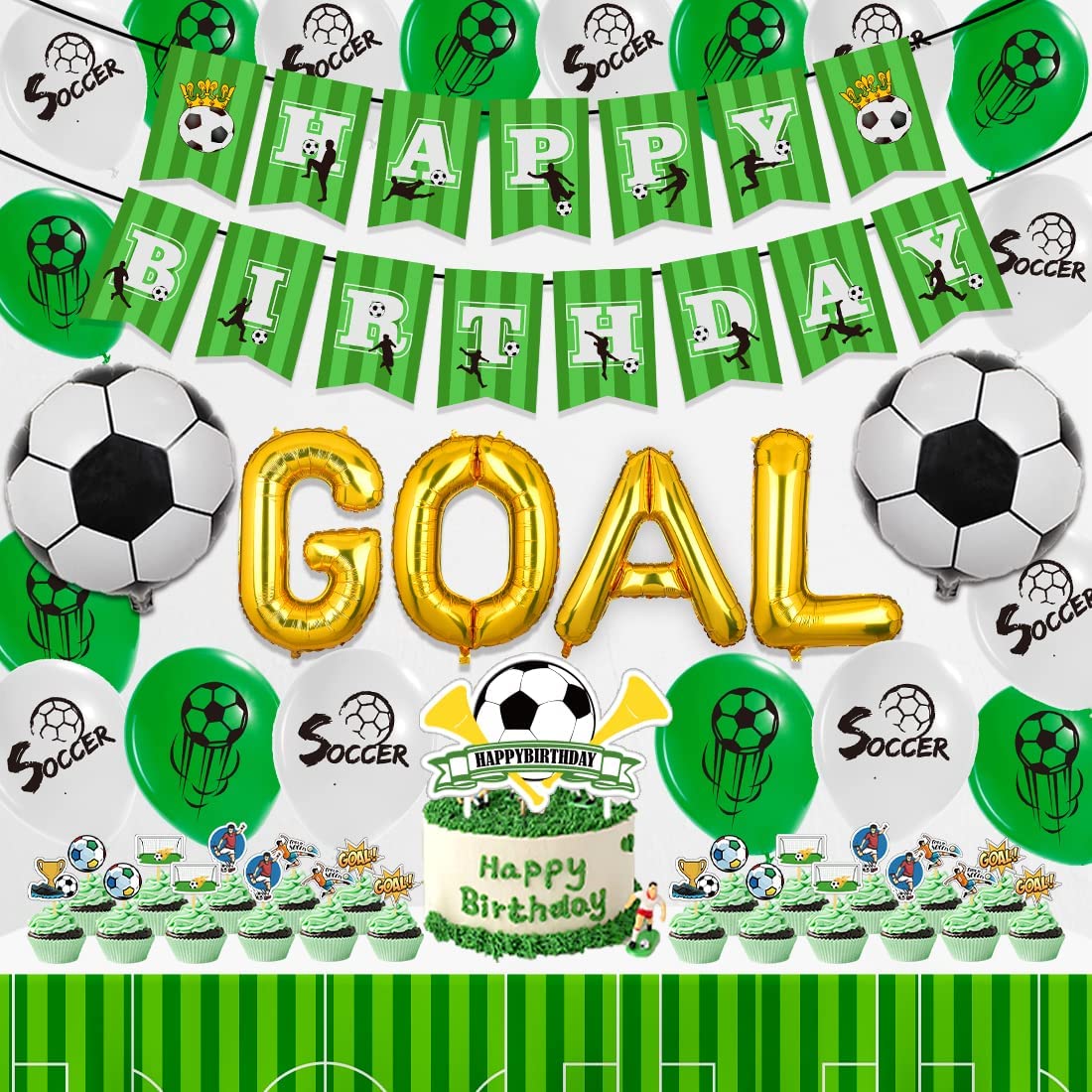 Soccer Birthday Party Supplies Includes- 1 happy birthday banner, 1 soccer cake topper, 24 soccer cupcake toppers,2 18 foil balloons, 4 16 foil bal…