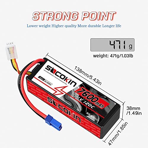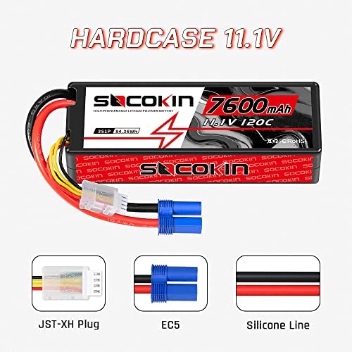 Compatibility–11.1V 120C 7600mAh Hard Case Lipo Battery with EC5 Connector is designed for RC airplane,RC vehicles,RC boat.Such as hobby models:1/8 and 1/10 rc car,Arrma,Slash X-Maxx, Traxcas Slash, Emaxx, Bandit, Rustler version, Losi,Team Associated,HPI Strada XB 1/10 RTR Electric Buggy,Axial, Tamiya, Duratrax, Jammin, Redcat Racing, Exceed RC, ElectrixRC, Emaxx, Bandit, Rustler version,etc.(Only if the voltage, dimension and the plug match, then it will fit).