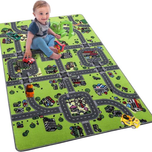 Playmat rug city life: This is a educational kids game carpet. The baby game rug have hotels, restaurants, funfairs, supermarkets, shops, hospitals, houses, and so on. It can improve childrens understanding of the traffic rules and city life, and create their imagination. Suitable for wide scope : Applicable to kids playroom, nursery, kindergarten, toddler bedroom, living room, baby’s room, boys / kids room, preschool and outdoors. A perfect 48 x 72 game carpet can create a funny place for children to play. High quality materials : The surface of childrens playing carpet is made of soft, and fade resistant polyester material to ensure the comfort of the children. The rubber backing has wear resistance and non-slip property, which prevents the floor carpet from sliding. The best present : The graphics are very clear and super cute for endless hours of play. Great for kids to play cars in the playmat rug. Perfect rug for toddlers playing cars. So its a great gift idea for your kids, nephew or grandchildren – Birthday, Childrens Day and Christmas. Easy to clean : Dust on the surface are easily removed. Just put the carpet in the washing machine and add some mild detergent for washing. Then dry in the ventilation to avoid direct sunlight. You never need to spend too much time cleaning it.