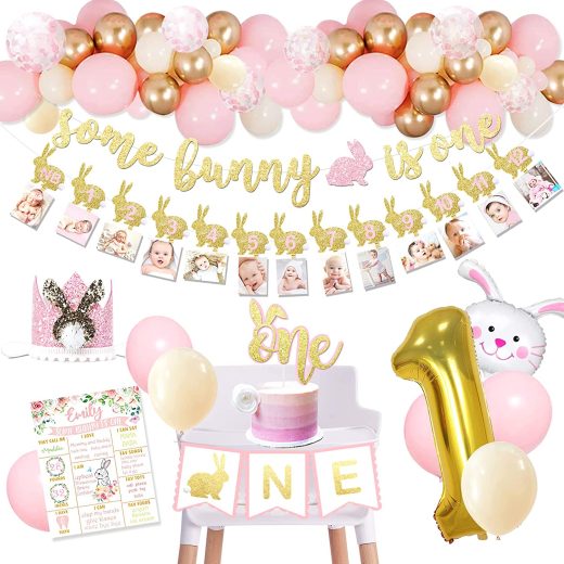 Some Bunny is One Party Supplies – Package includes: some bunny is one banner, monthly photo banner, one cake topper, first birthday crown, high ch…