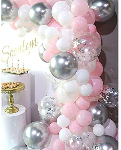 Soonlyn Pink Balloon Garland Kit 120 Pcs 12 In Pink Silver Metallic Balloons White Latex Balloons Arch Kit for Baby Shower Decorations Girl Birthday Party Bridal Shower Wedding