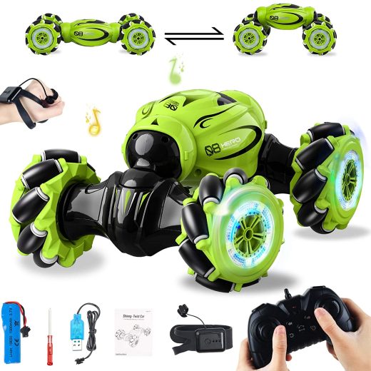 Watch/2.4GHZ Remote Dual Control Mode : Double sides running, 45°going sideways,walk cross,moving forward/backward, turning left/right,you can control the rc cars in any direction with its 2.4GHZ remote ;Watch Gesture Sensor Control and 360 degree rotating drift for different playing experience on this electric remote control stunt car.