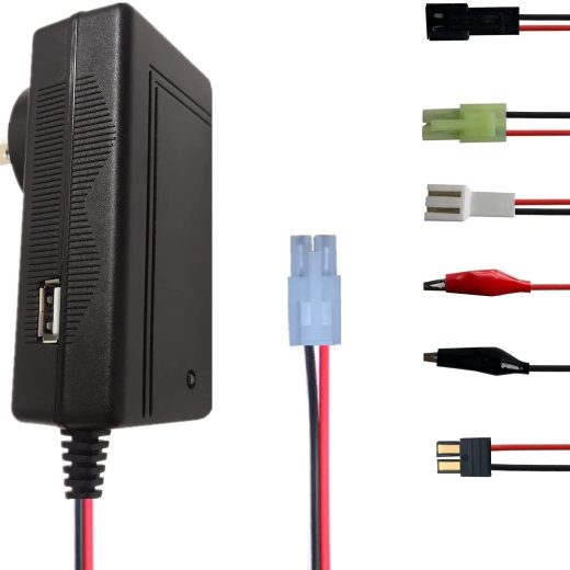 Safe and secure- FCC and CE certificated battery charger. Input 110-240V and USB Output: 5V – 2000mA, Charge Output: 3-8Cells (3.6-9.6V), charge current 1A, spark proof and reverse polarity protection during lead connection, short circuit protection, low/ over voltage protection, over current protection, over heat protection to Ensure your Safety.