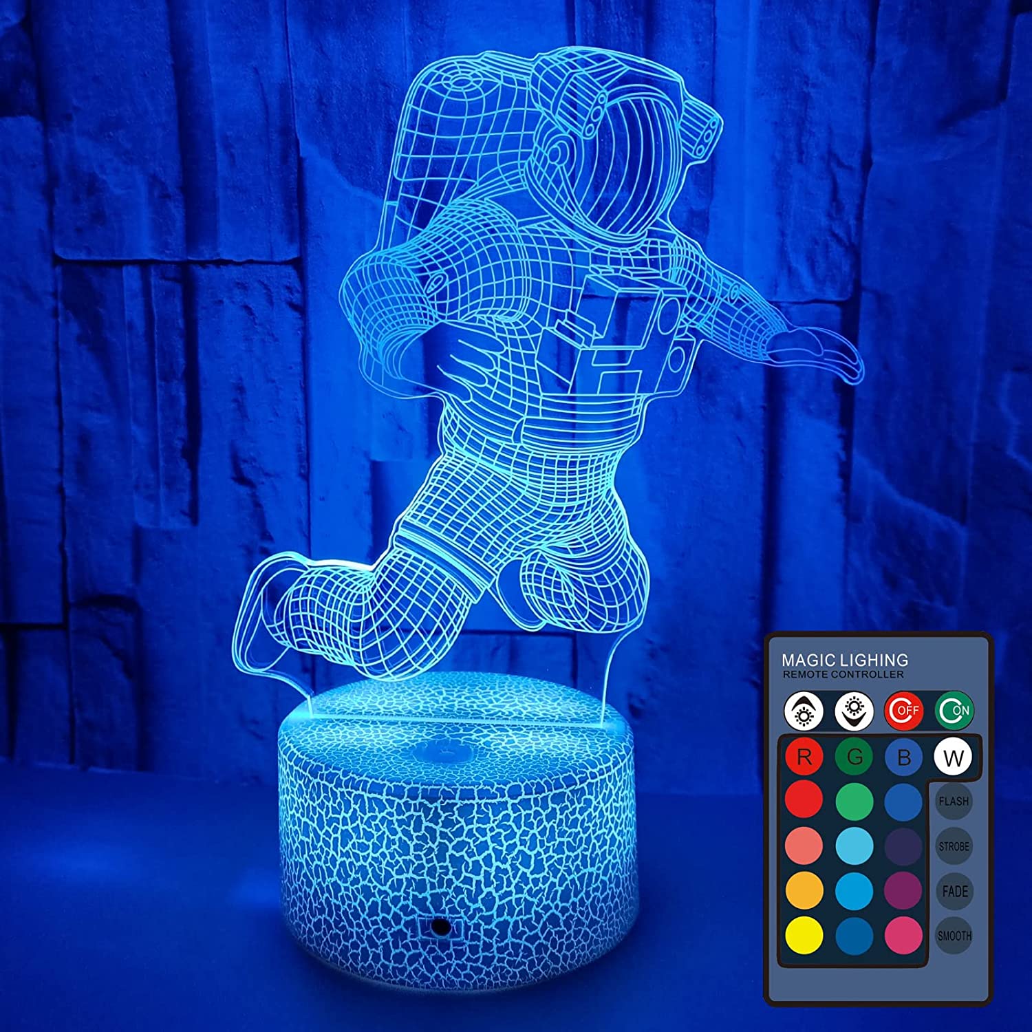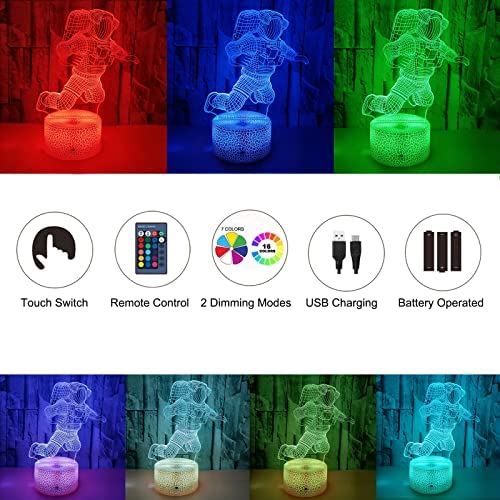 [3D Visual Effect] This amazing lamp inconceivably worked by a 2D wire frame lamp which is only a few millimeters wide. But everyone will be shocked by the 3D optical effect. Make your room more interesting, helping you to sleep better! [Optical Illusion] Red, green, blue, yellow, cyan, pink, white, color changing. can fixed one color or 7 color gradual changing. High quality LED light is soft and harmless to childrens eyes. Provide a sensitive remote, you can control the night light by the remote or button on the base. [Safety&Security] Spaceman night light adopt great LED light source with soft comfortable dimmable light, more eye-caring design protect childrens eyes. Durable and Energy Saving, The power spend: 0.012kw.h/24 hours, LED life span: 10000hours. Two power modes: 3 * AA battery (not included) or USB connection. [Perfect Gift & Decoration] Perfect for displaying in bedroom, homes, child room, living room, bar, shop, cafe, restaurant, partiesand more as decorative light or night light. Best gift for your kids, friends, family, relatives or your lovers on Birthday, Holidays, Christmas, etc. As bedside lamp at night, so that you and your children can enjoy sweet and warmth night. [100% GUARANTEE] We are confident with the quality of our product. We aim to make you happy with your purchase. If youre not satisfied, then CONTACT US and we will give you a 100% refund or a replacement.