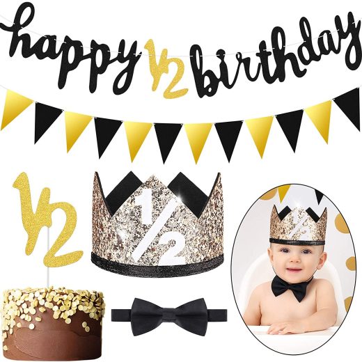 Spakon Glitter Half Birthday 6 Months Happy Birthday Banner Set Happy 1/2 Birthday Baby Boy Girl 1/2 Half Year Cake Topper Triangle Flag Banner 1/2 Birthday Crown Hat Bow Tie (Black and Gold)