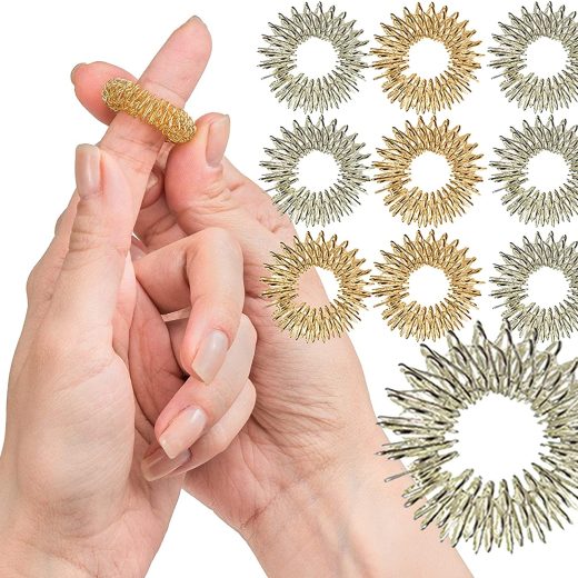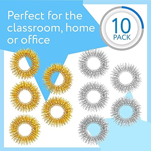Spiky Sensory Finger Rings: Whether in search of a new fidget toy or tactile / sensory toy, our spiky sensory finger rings are great for sensory and tactile stimulation. Roll them up and down your fingers for a fun and unique sensation High Quality: Made with high-quality stainless steel with an anodized coating, they are made to be strong and durable for kids and adults. They help create plenty of pressure and sensation through the acupressure process. Pack of ten means you can take them everywhere! Many Uses: Ideal for the classroom, home or office, theyre great for parents, teachers, students, therapists and more. A fantastic alternative to other sensory toys, including sensory brushes and rolls. Units are 1 in diameter and 0.3 tall. 10-pk as shown Ideal For Children And Adults Of Many Needs: Fidget and sensory toys are great for children ages 3+ and adults, but especially helpful for those with attention disorders, OCD, special needs, or high anxiety levels. These toys help promote a sense of calm, help reduce stress / anxiety and can help increase focus / attention Great Addition To A Collection: Great addition to a collection of fidgets / fidget toys, including squishy stress relief balls, tangle toys, rings, jewelry, necklaces, twiddle toys, pencil toppers, spiky bracelets, fidget cubes, hourglass fidgets, spiky rings, etc.