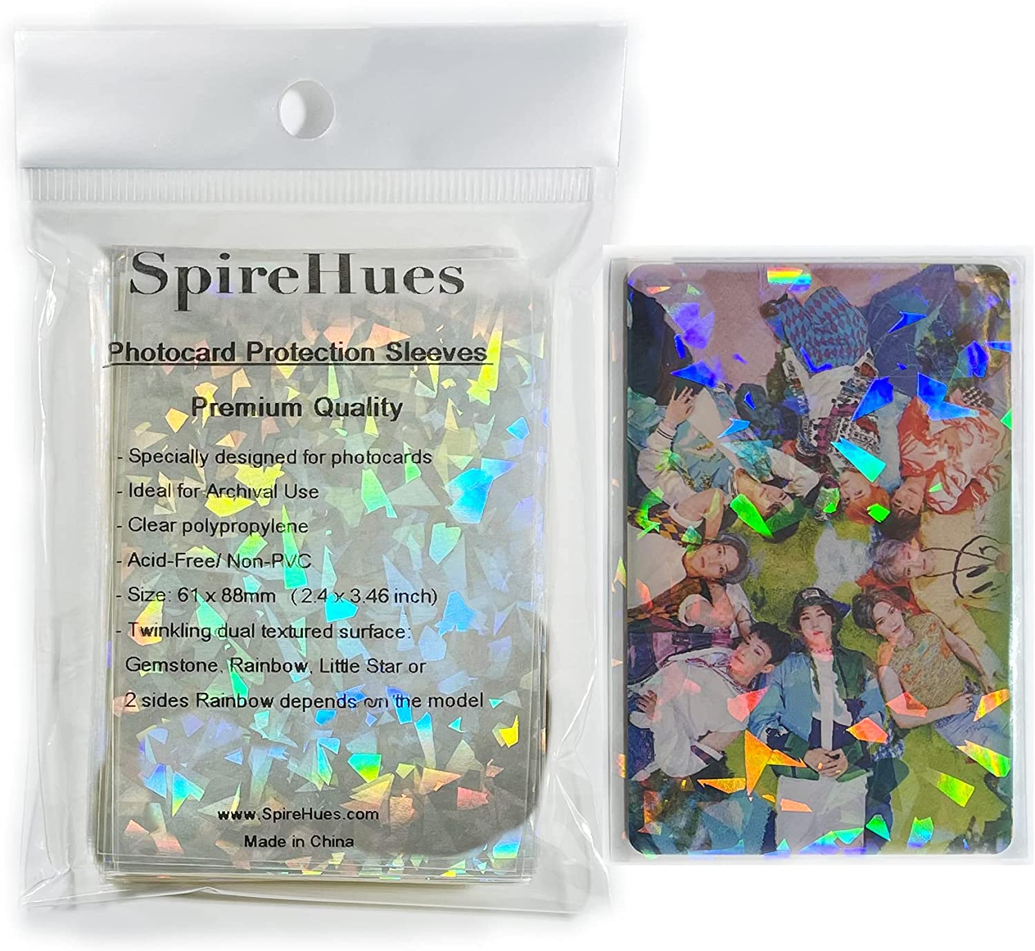 SpireHues 100 Pcs Holographic Photocard Protection Sleeves for Trading Cards and photocards5 Designs: Heart, Gemstone, Rainbow, Little Stars and Rainbow 2 sides.3 Sizes: 2.28×3.5in (58x89mm), 2.4×3.46in (61x88mm) and 2.56×3.54in (65x90mm) Premium Quality: Specifically designed for kpop photocards collection. Water-proof, dust-proof, and keeping your photocards no fading.Wide Usage: Baseball Card, Football Card, Sports Cards, MTG, Yugioh, Pokemon, or Popstar photocard.Acid-Free/Non-PVC: Archival Grade and Suitable for Professional Play.
