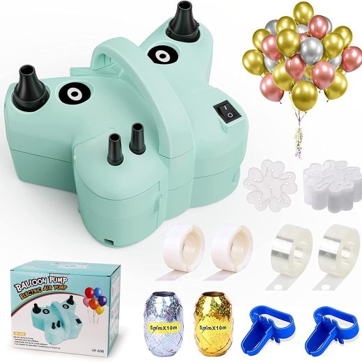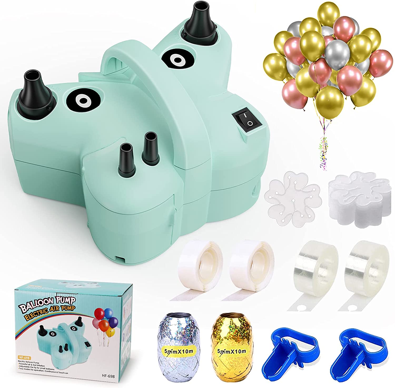 Efficient and Safe Experience Splaks balloon pump uses a newly upgraded motor with overheating protection, which guarantees stronger power and safer experience. A 10 inch balloon can be inflated in 2 seconds, saving your time and energy. Balloon Pump & Completely Garland kitA party seems imperfect without balloon decorations. Splaks balloon pump sets provide everything you needed for party, completely balloon garland kits for birthday wedding christams decrations. Including 10 inch Metallic Gold/Silver/Rose Gold Balloons*45, 16 feet Balloon Tape Strips*2, 16 feet Dot Glues*2, Tying Tools*2, Flower Clips*10. 32 feet Color Ribbon*2. Lightweight & Portable DesignInput voltage: 110-120V. Weight: 1.9LB. Lightweight, you can easily take it to anywhere you like. It is a good option for school graduation part, office party and family party. Unique designDifferent from traditional balloon pumps, Splaks electric balloon pump uses the butterfly shape, which brings smaller size and more exquisite appearance. The light green color is just like a butterfly flying in the forest, free and elegant. A Wonderful GiftSplaks balloon pump helps your friends/lovers/family and you to decorate a party quickly. Save much time and energy to have a carnival and celebrate. Go! Have fun with your friends.
