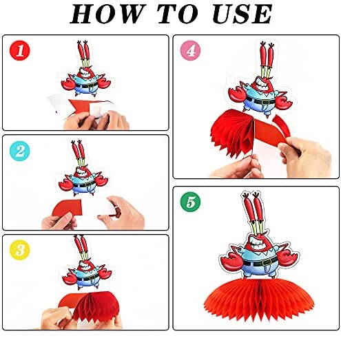 Products Include: You will receive 7 Pcs honeycomb centerpieces. Each bob centerpieces sizes are about 6 inches. The party table decorations are made of high-quality cards, which are seamless, durable, lightweight, non-fading, and thick. Unique Design: The honeycomb decorations pattern of bob theme, Including Patrick, Mr. Krabs, Squidward, Sandy, Gary, Plankton. The unique, eye-catching birthday party center decorations will definitely attract peoples attention. Easy to Assemble: Just take a few seconds to assemble. Tear off the sticker of the honeycomb ball, stick the honeycomb ball to a fixed area on the card, repeat on the other side of the card, finally put it stand on the table. Great Birthday Party Supplies: Bob SquarePants themed honeycomb centerpieces are suitable for baby shower, childrens parties, family gatherings, school recreational activities, or other decorations. If you are going to throw a Spongeob theme party, the honeycomb centerpieces make for fantastic decorations, everyone will love these chic designs. Quality Assurance: If you have any questions about the party center, please contact us via email, we will provide you with a satisfactory solution.
