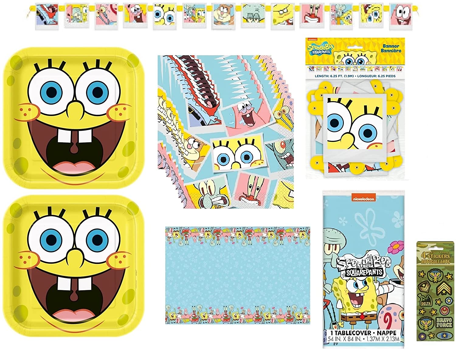Spongebob SquarePant Birthday Party Supplies Decoration Bundle Pack for 16 Includes 16 Lunch Plates, 16 Lunch Napkins, 1 Table Cover, 1 Happy Birthday Banner, 4 Camo Sticker Sheets (Not Spongebob stickers).