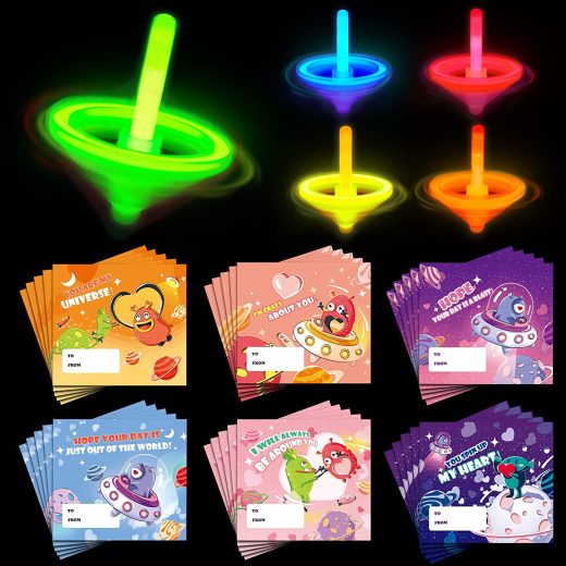 24 Pack of Valentines Day Gifts . Our valentines party favor toy set includes 24 valentines day cards,come in 6 designs with different punchline, and 24 glow in the dark spinning tops. There are 6 different colors of the glows sticks for the spinning tops.Each glow spinning top could be assembled by two glow sticks and one plastic spinning top. Easy to Make and Safe. Bend and snap the glow stick along the entire length to break the inner tube,shake vigorously to ensure entire glow stick is illuminated.Link up glow sticks with the spinning tops. You will get a novel light up spinning top. The glow stick is made of high quality material which is safe for kids.The glow sticks are non-leaking and non-toxic. Unique Design.Have your little one writes his/her name on the cards and hand them out to their friends on Valentines Day or slip them into Valentines Day favor bags during a classroom gift exchange,these light up spinning top with Valentine Cards will be a hit. Ideal Gift. Its a great gift option for kids school classroom prizes, gift exchange, love notes, school valentines parties or any valentines occasions. Glow stick combine spinning tops which makes the Valentines Day gift stand out from others and also leave a good memory for this Valentines Day for people who receive gifts! Premium quality and service-Made with durable 100% non-toxic ABS plastic. Toy set CERTIFIED Conforms to us toy safety standards ASTM F963.