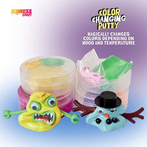 An exciting way to make great childhood memories is to play something that works like magic using a tool from a name that never gets old in its industry.Not just any other Putty but a Color Changing Frudge from Squeeze Craft!Squeeze Craft Heat-Sensitive Putty Toy comes in a Pack of 6 containers. Its a soft dough that changes color with the heat of your hands or environment temperature! Each one of these slime-putties comes will accessories to turn your moldable ooze into a cool and creepy monster or snowman. Assorted colors include dark purple, magenta, blue, green, and orange. Each magic putty will bounce like a rubber and stretch like a chewing gum.Putty heat sensitive is a composition of premium grade thermochromic elements that are hypoallergenic and non-toxic. It is soft, slimy and squishy for your kids little hands. Recommended for ages 5+ with adult supervision.Use this silly-putty clay to add extra fun in a Summer getaway or sleepover. Just remove from individual can and play your fingers around it then bend, shape, roll, squish and more. Place it in the cold storage then against a warm mug to witness an even more intense color change. Add the included character accessories and you mud collection will be complete.The Colorful Putty is designed for relaxation and manipulative ability at home, school, and the office. Its squeezy and slippery texture makes a pleasant and self-pacifying tool for children and teens; and a great stress-reliever desk toy for homework, office breaks, meetings, or to fidget with during long phone calls.Great party favors, loot bag stuffers, a treasure in a mystery box, or gaming materials for your friends and family on birthdays, baby showers, Slumber parties, Easter Sunday, Halloween, Christmas season, Year-end celebration or any occasion. It will also work as kids awesome compensation for their improving behavior and academic achievement.