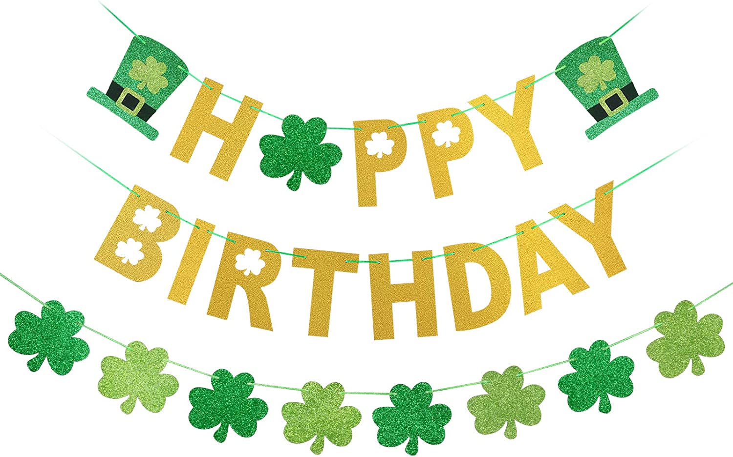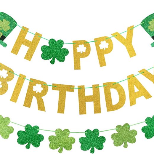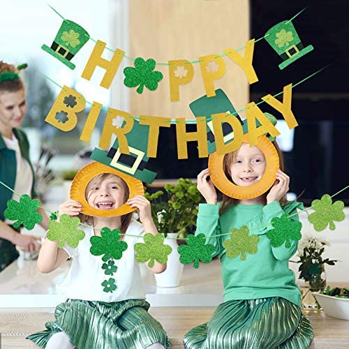 St. Patricks Day Birthday Decorations: Unique font design and shamrock shape design,full St Patricks day feeling.It is a must-have banner to celebrate your birthday party decor, brighten up your home. Package Include: 1pcs happy birthday banner and 1pcs four leaf clover shamrock banner.Create a completely warm birthday party atmosphere for you and adding a little sparkle to your St. Patrick s Day party decor. Easy To Use: Its very simple and just place a ribbon through the hole at the top of each letter cardstock,a little DIY.You can use it as an excellent backdrop or photo prop to decorate the home, fireplace, mantle, wall, dessert table, lawn, tree and anywhere you like. High Quality: Made of gold and green glittert eco-friendly cardstock and the banner letter length approx is 6.7, the four leaf clover shamrock size is 6.3 width x 5.9 height. Worth Buying It: This St. Patricks happy birthday banner will be a hit to your home deocraitons and create a festive atmosphere for your birthday.Wish the luck of the Irish follow you,enjoy the festive time.Buy it now!