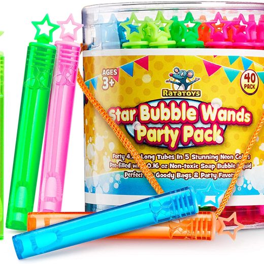Set The Party On Fire With A Stunning 40-Piece Mini Star Bubble Wands Set!Looking for…… a party favors set for your kid’s birthday party… a wedding, bachelorette or graduation party toy pack for your guests… an adorable summer gifts set… a bath toy set to make bath time the best part of the day for your toddlerLook no further!Ratatoys 40-piece small star neon bubble wands will blow your mind!Fill The Air With Colorful Bubbles & Have The Fun Of Your Life! Spice up your little adventurer’s birthday party, liven up the formal corporate event and brighten the Valentine’s, wedding, anniversary or graduation celebration!The 40 mini bubble wands of this Money Saver set come pre-filled with odorless bubble soap liquid, in neon colorful tubes in 5 assorted colors, Green, Blue, Pink, Yellow & Orange.Make the party day unforgettable for your guests, with head-turning bubbles floating in the air of your home, garden, poolside or outdoor party!Why Choose Ratatoys Party Bubble Wands Set 40 mini bubble wands 16Oz in 5 assorted neon tubes Fun bubble toy wands pre-filled with top quality liquid soap Non-toxic, odor-free bubble soap Summer gift safe for kids aged 3+ Best bath toy for girls & boys Great for wedding party favors, Carnival, Goodie Bags, Stocking Stuffers & Holiday gifts Offered in sturdy storage bucket Perfect for indoors & outdoors A Great Gifting Idea!As the ideal summer, bathtub, shower or beach toy gift set, Ratatoys kids’ bubble wands are also great to be offered as a classroom reward gift or as a kids’ fun party toy set.Spoil your loved ones!So, What Are You Waiting ForClick Add To Cart NOW & Give In To Endless Hours Of Fun!