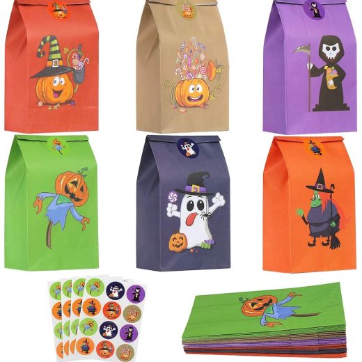 Value Pack:Package contains 36 PCS Halloween paper bags,and 48 pieces Halloween cute cartoon pattern stickers,value combo set for your Halloween party supplies Novel Halloween Design:Our Halloween paper gift bags designed with novel cute Halloween character pattern,E.g Zombie,Ghost,Pumpkin and more,totally 6 different patterns,add fun to your Halloween party High Quality Material:These Halloween paper treat bags are made of high quality paper material,the paper is thick and has strong tension which makes it not easy to break and tear,kids can full-fill the candy in the bag without breaking,suitable for Halloween party supplies Size:Each Halloween paper bag measures 7 x 4 x 2.4 inches,enough space for candies,snacks and other Halloween party small items Nice Item for Halloween:This Halloween paper bags is ideal for gift wrapping,Halloween party supplies,kids birthday party and more,create a strong atmosphere for your Halloween festival