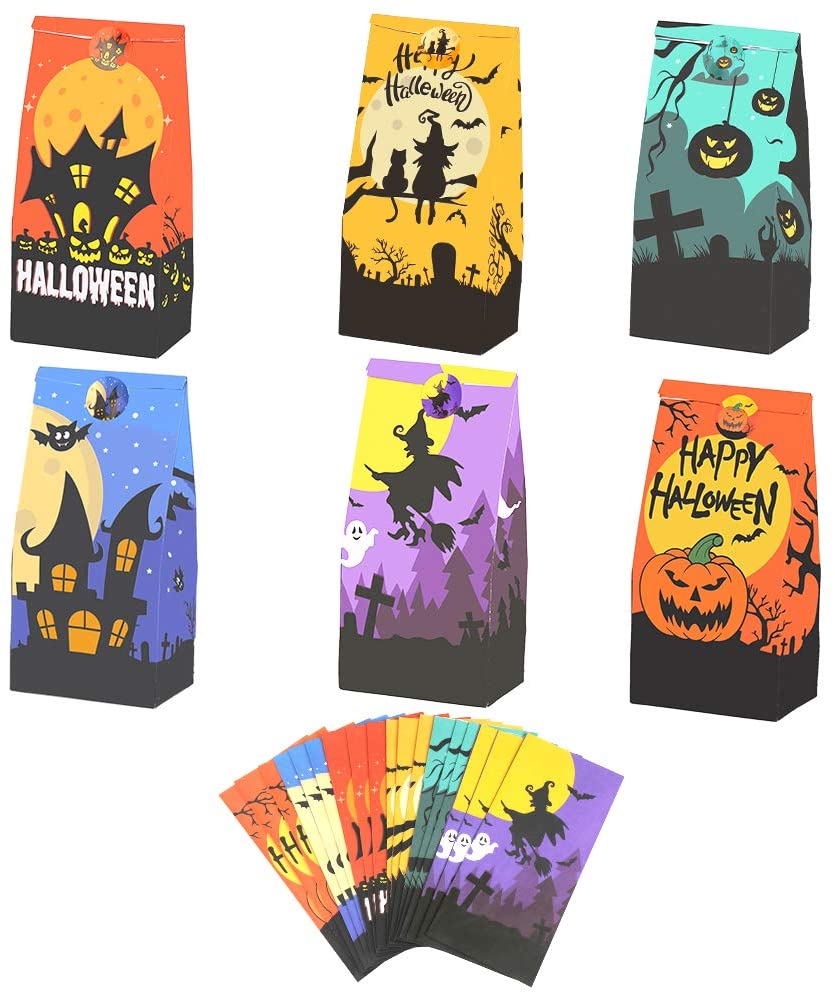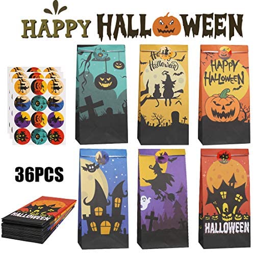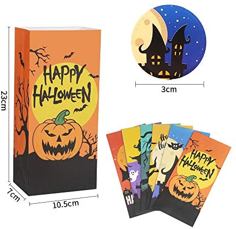 Value Pack:Package contains 36 PCS Halloween paper bags and 36 pieces cute Halloween sealing stickers,sufficient quantity meet your different requirements on Halloween or parties Novel Halloween Elements:These Halloween paper gift bags designed with 6 different Halloween element patterns and 12 different types of cute stickers,specifically designed for kids preferences,they gonna love it High Quality Material:These Halloween paper treat bags made of high-quality craft paper,easy to unfold or fold for convenient carrying,Whether you are giving it as a gift or as a decoration for Halloween party,this is a good choice Size:The Halloween paper bag measures 10.5x7x23 cm/4×2.8×9 inches,and the size of sticker is 3 cm/1.2 inches,enough space for candies,cookies,toys and other small items Multi-Uses:The Halloween paper bags suitable for Halloween party,birthday party,Christmas party…ect,and it can also be a good container for candies,cookies,snacks,toys and ect