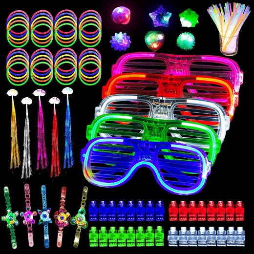 Light up your neon glow birthday party with LED! Feature: – Glow in the dark glasses kids do not block the line of sight, no glare, no heat. These neon glasses will bring your shindig. Just press the button to switch to the flash mode of your party glasses. – The light up party favors for kids is made of high-quality materials, which can ensure up to 7-10 hours of light. The light up glasses party favors are made of high-quality PC plastic, strong, safe and durable. – Each finger light has an elastic band, glow in the dark party favors adults are suitable for everyone. Wear them and you will become a gathering center for everyones attention. – This bulk pinata filler colorful LED party favors finger lights glow necklaces glow in the dark toys and party sunglasses will brighten your mood or party atmosphere! – Glow party packs for kids teens are very suitable for luminous parties, neon theme party gifts, birthday parties, concerts, dance parties, fireworks shows, classroom rewards, carnivals, weddings, camping trips, Halloween party supplies, Christmas parties, kids party supplies, New Years Eve parties, Valentines Day party, etc.! Specification: Materials: Plastic, rubber Quantity: 142 Pack Weight: 600G Size: 30*20*5cm Color: Pink, Green, Red, Purple, Blue, White Package Including: 50* neon glow sticks party pack 32* finger lights 5* light up glasses 5*LED Spinning Tops 6*Light up jelly rings 5* Fiber optic LED lights hair Notes: – Batteries are included and installed. – We recommend Children under the age of 3 need for Adult supervision.