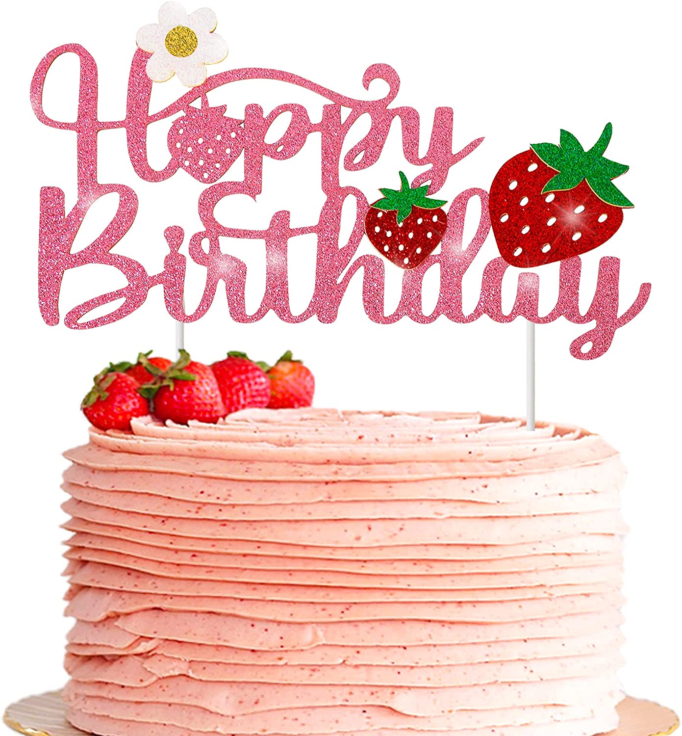 Strawberry Theme Birthday Party Decoration, Happy Birthday Cake Topper for Berry Sweet Party Summer Fruit Themed Party Food Picks Supplie