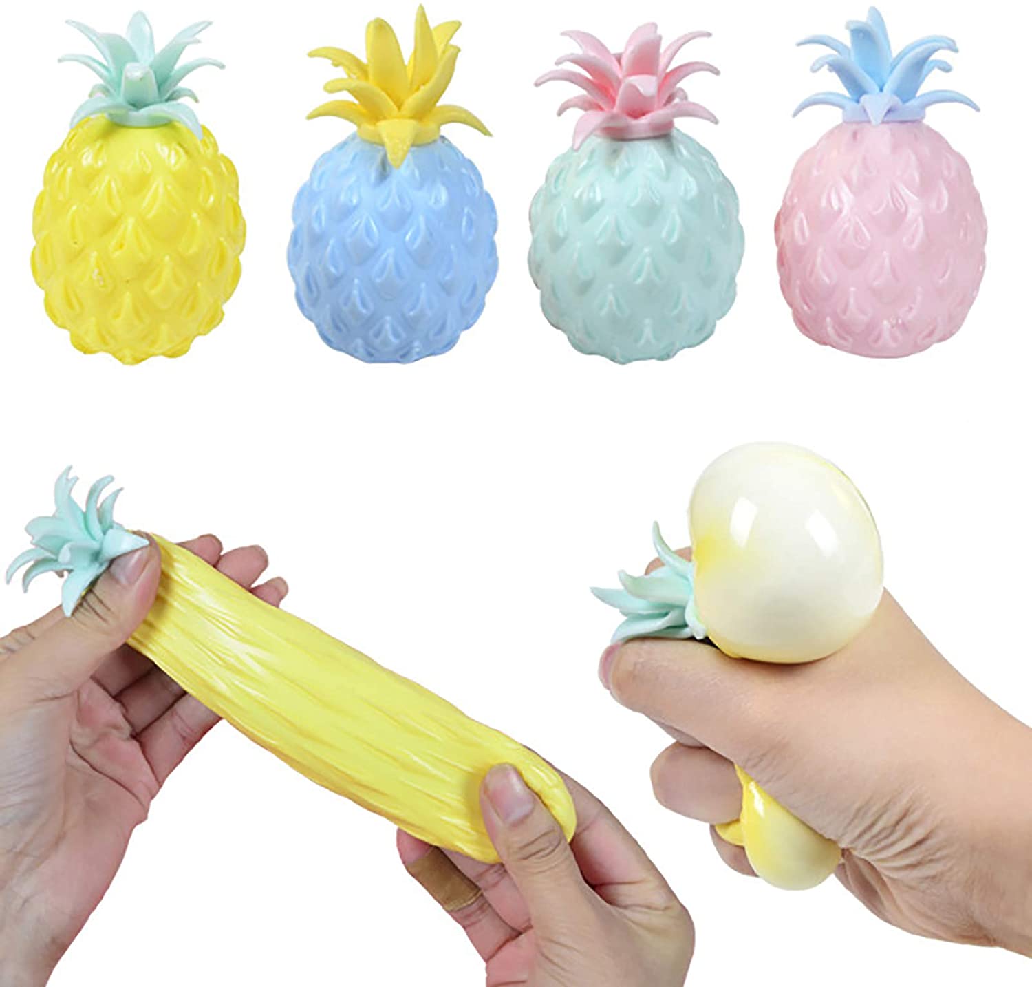 [Material] The anti-anxiety fruit squishy is made of soft and high-elastic TPR and EVA, providing you with a good texture. [Fun to play] Pull the squishies stress ball hard, and it will deform. Then let it go, and it recovers back. [Function] The squishy fidget pineapple fidget toy can help reduce stress and anxiety in our daily life and work; make adults laugh while stretching the fidget toy. [Gift] Its a surprised gift for your friends. You can imagine how fun they are when stretching the tropical fruit pineapple into a noodle. [Package] 1x piece squishy toy pineapple with random colors. Specifying colors is not applicable. The 4 packs have four different colors. Please choose according to your needs. Kindly remind keep the squishy fidget toy away from heat and fire.
