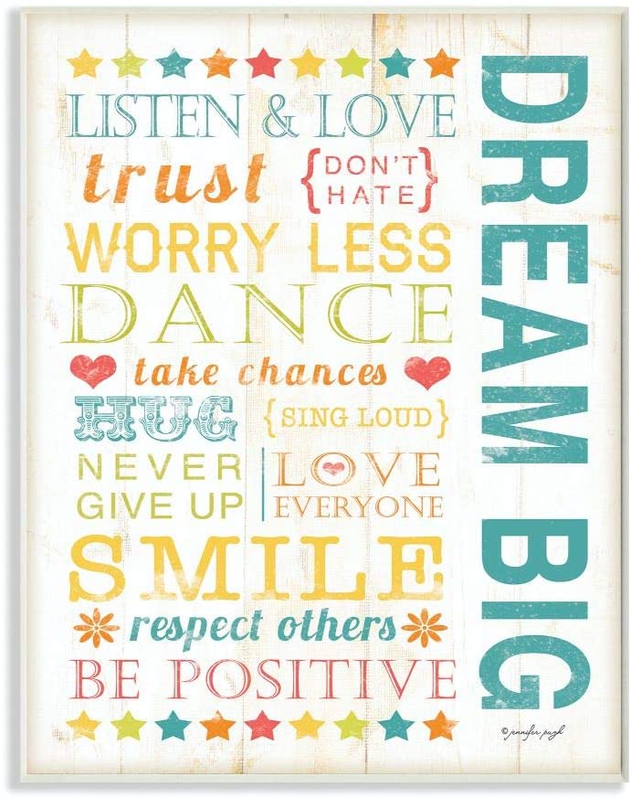 Surface Recommendation Wall The Kids Room by Stupell Color Dream Big Kids Typography Rules Room Type Kitchen, Bathroom, Bedroom, Living Room, Dining Room Material Wood Pattern Solid Item Dimensions LxWxH 10 x 15 x 0.5 inches Unit Count 1 Count Finish Type Multicolor Number of Items 1