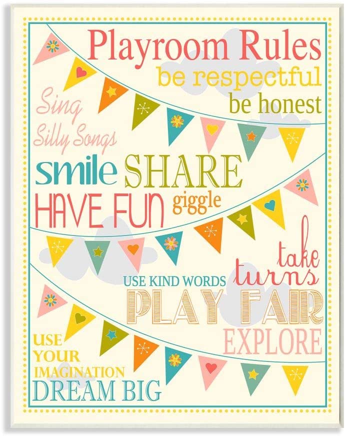 Stupell Home Décor Playroom Rules With Pennants In Pink Rectangle Wall Plaque, 10.25 x 0.5 x 14.75, Proudly Made in USA