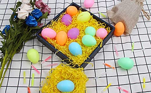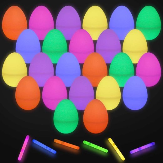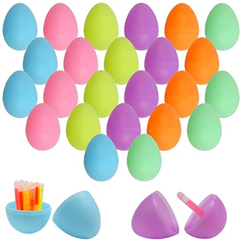 Package includes: 24 pack plastic Easter eggs in vibrant pink, yellow, blue, green, orange and purple colors(4 of each color) and 48 glow sticks Size: These plastic eggs measure approx 1.5 x 2.3 inches, and shake the glow sticks to glow bright for 6-10 hours Material: These eggs are made from durable plastic that is nontoxic and non leaking glow in the dark party favors are safe and fun for kids ages 3 and up Unique design: These empty bright colored eggs is good for hiding from the Easter bunny, Perfect for all children, both for girls and for boys Widely use: Use these glow stickers in the dark party favors as party decorations or use in the pool or during bathtime; these waterproof glow party supplies float, are non leaking