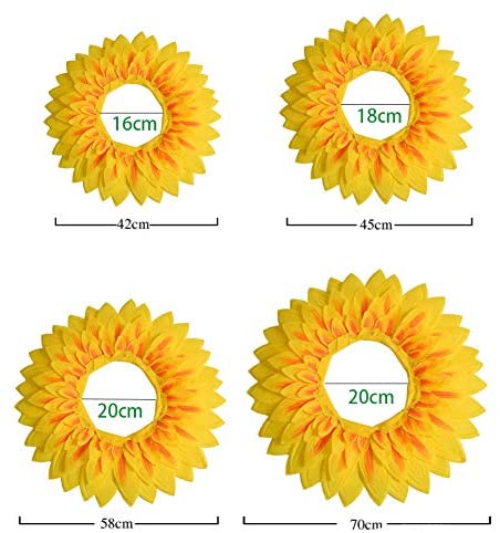 Features: Interesting sunflower headgear, easy to wear and take off. Bright colors are easy to see. It is the perfect prop for children to perform. It is also an interesting prop in the game. I believe this sunflower headgear will bring you joy. Specifications: Material:Cloth Color:Yellow Size(Whole diameter):42cm/58cm Package included:1pc x Sunflower headgear props Note: we received advice from customers that the hood is too large for children. under 4 years, so we recommend buying it to use for children over 5 years and adults.