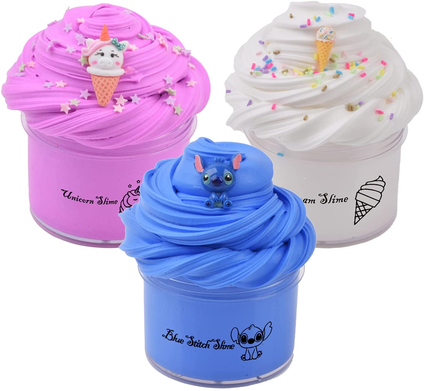 Sunool 3 Pack Butter Slime, Blue Stitch, Rose Unicron, White Icecream Slime Putty Stress Relief and Scented Sludge Toy for Boys and Girls