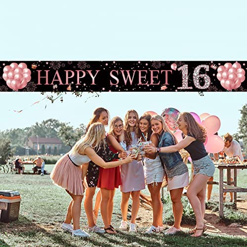 Sweet 16 Birthday Decorations Banner, Sweet Sixteen Decorations for Girls, Rose Gold Happy 16th Birthday Decorations Yard Banner, 16 Year Old Birthday Backdrop Supplies, Extra-Long 13ft x 1.6ft PHEXY