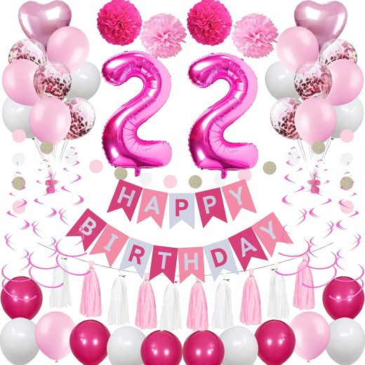 54PCS BIRTHDAY DECORATION KIT: This sweet 22nd happy birthday decor includes ‘HAPPY BIRTHDAY’ banner*1, number 22 foil balloons*2, hanging swirls*6, circle dots garland*1 set, tissue paper tassel (white*5, pink*5), latex balloons (white*8, pink*8, deep pink*6, rose gold confetti*6), pink heart foil balloons*2, paper pompoms (pink*2, deep pink*2), this pink white theme ornaments will meet all your needs. CRAFTED FOR PINK BIRTHDAY PARTY: Sweet pink and white theme 22nd birthday decorations are crafted for women girls daughter her girlfriend family; number 22 deep pink foil balloons are perfect for your 22 years old birthday party; these ornaments will certainly add a warm and sweet atmosphere to your party. NO COMPROMISE ON QUALITY: We promise our balloons use pure natural latex, which are safe, non-toxic, eco-friendly, besides, thicker material ensures that balloons are elastic and not easy to explode. WARM TIPS: The twinkling hanging swirls set includes 6 double helix streamers, each about 28 inches; the tissue paper tassel set includes 10PCS, you need to make your tassel by yourself; the latex balloons can be filled with helium or air, avoid direct sunburn or heating. OUR 100% COMMITMENT: Once you are not satisfied with your purchase, you will receive a FULL refund or replacement. As soon as your products arrive, check the items and let us know if there is anything missing so we can replace one right away.