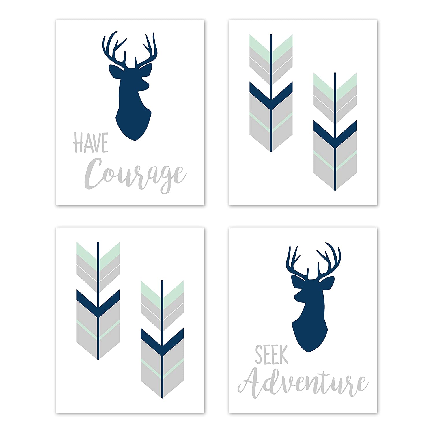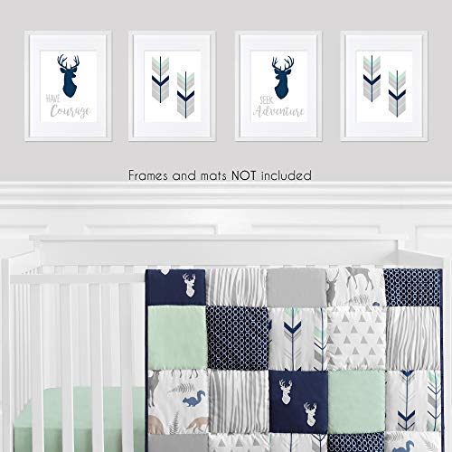 Sweet Jojo Designs Navy Blue, Mint and Grey Woodland Deer Wall Art Prints Room Decor for Baby, Nursery, and Kids for Woodsy Collection – Set of 4 – Seek Adventure Have Courage