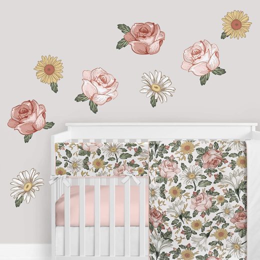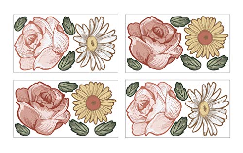 Sweet Jojo Designs Vintage Floral Boho Peel and Stick Wall Decal Stickers Art Nursery Decor – Set of 4 Sheets – Blush Pink, Yellow, Green and White Shabby Chic Rose Flower Farmhouse