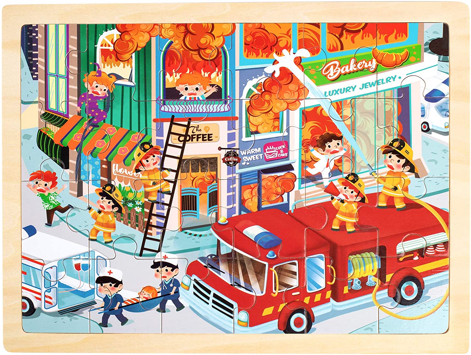 SYNARRY 24 Pieces Puzzles for Kids Ages 3-5, Fire Rescue Wooden Jigsaw Puzzles with Storage Tray, Educational Preschool Learning Toys Gift Set for Children Toddler Boys and Girls