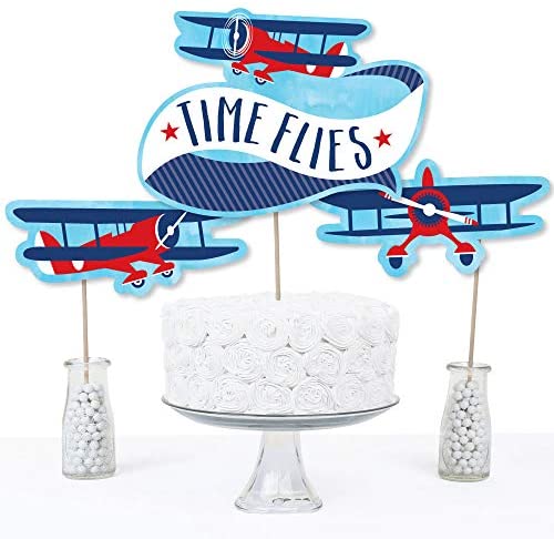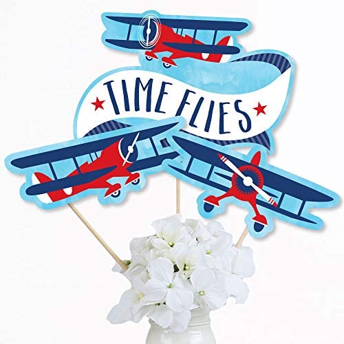 Taking Flight – Airplane Centerpiece Sticks INCLUDES 15 Taking Flight – Airplane table toppers in three different shapes, 15 wooden dowel sticks and stickers for easy assembly. Vintage airplane party table decorations are perfect for a baby shower or birthday party. Taking Flight – Airplane Party Centerpiece Sticks SIZE five Time flies table toppers, 10.75” wide x 7.75” tall; five Airplane side view table toppers, 9” wide x 3.5” tall; and five Airplane front view table toppers, 9” wide x 4.5” tall. The unique design and variety of pieces makes this table decoration kit an impressive addition to any airplane theme party. EASY PARTY DECOR: Taking Flight – Airplane table decorations can be used as centerpieces when attached to the included dowels and inserted into vases or floral arrangements. They easily accent your baby shower or birthday party candy buffet when you add them to apothecary jars. Table toppers are also a great addition to any photo booth. The large shaped cut outs will make your party pics instantly shareable. Airplane centerpiece sticks are sure to make a statement however you choose. PREMIUM PARTY SUPPLIES: Taking Flight – Airplane party table toppers are professionally printed on heavy-duty cardstock paper with a photo-like shine. They are individually inspected and carefully packaged by hand with wooden dowels and stickers for easy assembly. Get creative with your DIY party ideas! MADE IN THE USA: Taking Flight – Airplane Baby Shower and Birthday Party Centerpiece Sticks are designed and manufactured at our Wisconsin facility using materials that are Made in America.