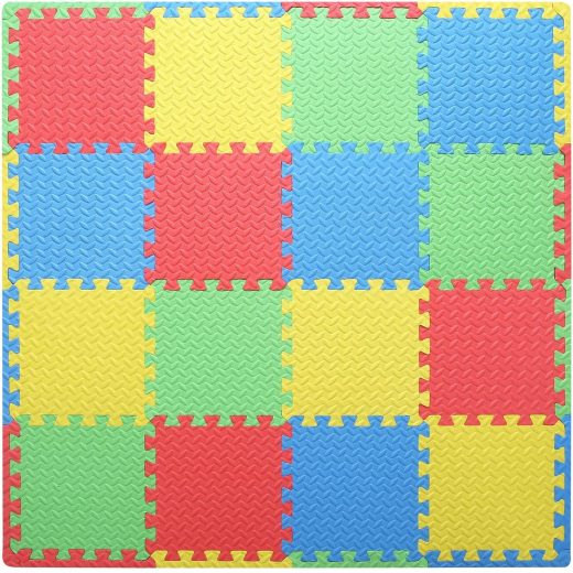 16Pcs Squares Foam Play Mat — The size of each tile is (11.81*11.81*0.4 inches). The area of 4×4 is (16 sq.ft). Item comes with 16 boders and 4 solid colors (red, yellow, blue and green), each color has 4 tiles Non-Toxic And Safe Materials — Non-toxic, tested free of lead, bpas and Phthalate, safe EVA Foam material, will not harm the babys skin 0.4 Inch Thickness Floor Mats For Kids — It has good cushioning performance and can cushion the elbows, knees, hips, waist, and spine on hard floors. It can prevent the baby from falling and hurting Simple To Assemble — with interlocking teeth on the edge, light weight, easy to assemble and disassemble. Can be assembled with play mats of the same thickness in the Tamiplay store For Multiple Scenarios — The puzzle play mat suitable for floors, bedroom, living room, study room, playroom, childrens room, balcony, sports, yoga and fitness