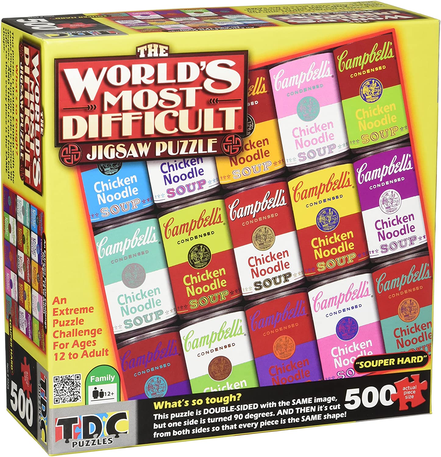 SOUPER HARD: Get your hands on the world’s hardest puzzle. The entire puzzle measures 15 x 15 inches when assembled and contains 500 Campbell’s Soup themed jigsaw puzzle pieces. To amp up the difficulty each piece is double sided with the same overall main image. 90º TILT: Test your patience with this extreme puzzle challenge. To make things more interesting both sides of the puzzle are the same image but one is tilted 90 degrees. Recommended for ages 12 and up. FAMILY FUN: Looking for a way to spend quality, unplugged time together This puzzle is just what you need to keep everyone entertained for hours. Watch as your loved ones become obsessed with figuring out this extreme puzzle. GOOD FOR YOU: The benefits of puzzles are enormous. Children who partake in puzzles boost their critical thinking, problem solving, spatial awareness, and socialization skills making it a great addition to any classroom or household. TDC GAMES: Making the world’s zaniest party games and exceptional puzzles since 1984. Our games are fresh and imaginative with a twist of humor. TDC Games has been honored with many awards including the following: The Fat Brain Award, The National Parenting Center Seal of Approval & The Tilliwig Best Family Fun Award.