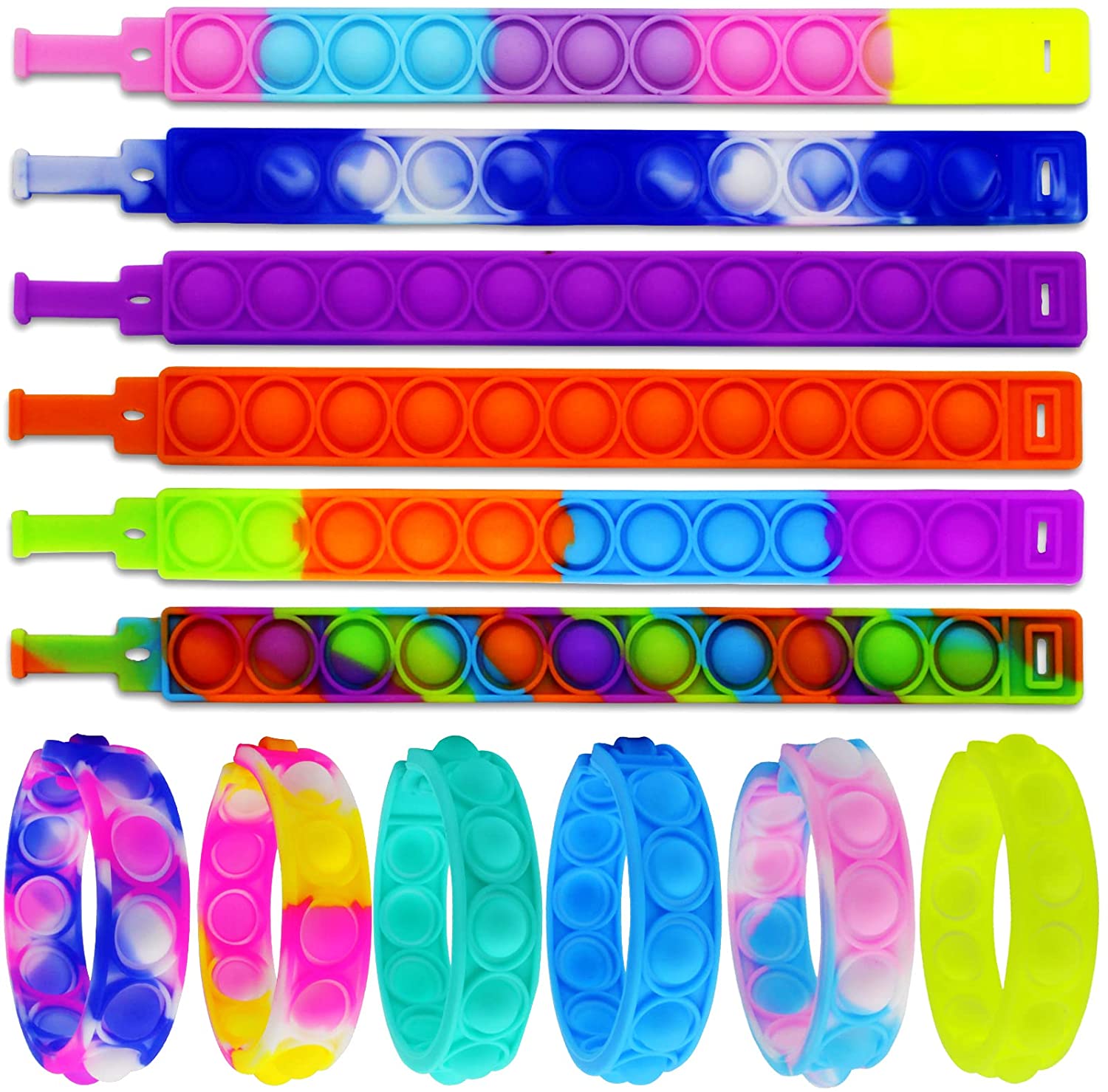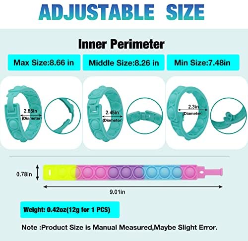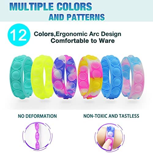 Fashionable Push bubble BraceletThese bracelets stylish colors,patterns and quirky style make it easy to match with different outfits. Making you look more interesting and attractive. Instant Stress ReliefThese excellent sensory fidget toys can aids with focus and attention by allowing the brain to filter extraneous sensory information. By keeping the hands engaged in simple, repetitive motor movements, the player is able to keep their attention from being disturbed by surroundings. Let it snug to your wrist and squeeze it over and over again.Some people with anxiety, stress, or autism find that fidget toys offer the tactile sensory input and help them with self-regulation. Safe Material and No Small Metal PartsThere are no any small metal parts on them.These bracelets are made of high-quality silicone material, water-proof , soft and easy to clean by water, will not cause any harm to humans and pets.so you don’t need to worry about the safety,especially for your kids. Easy to CarryThese Pop Bubble bracelet are portable toys.No need to put it in a bag or pockets as it can snug on your wrist all day long! You can have fun anywhere, anytime.Ideal for travel, school, work, party, and more scenarios ! Ideal toys for kids as it can’t be lost easily even when playing. MultifunctionalThese convenient push bubble bracelets are fabulous alternative to other toys! Colorful pop bubble bracelet not only a good sensory toy but also a stylish ornament .